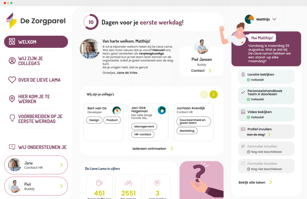 Sibi ziet de employee journey niet als een reis die pas begint op de eerste werkdag. Het platform ondersteunt medewerkers daarom al vanaf de preboarding: de periode tussen het tekenen van het contract en de eerste werkdag. Nieuwe collega’s worden ontvangen via een persoonlijk onboardingsportaal. Dit portaal is op maat ingericht en passend bij de cultuur van de zorgorganisatie.